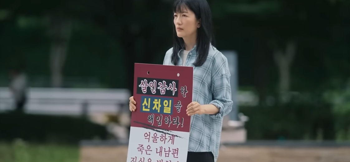 회사 앞으로 김만수의 부인이 나타나 1인시위를 하기 시작합니다.. 자신의 남편이 죽은 이유를 밝혀달라는 것이었죠.