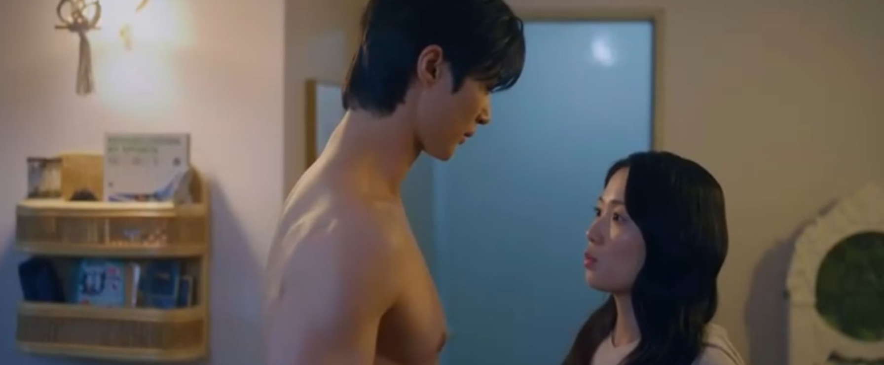 샤워를 하고 옷이 없어서 상탈을 하고 나오는 선재를 보고 솔은 놀랍니다......