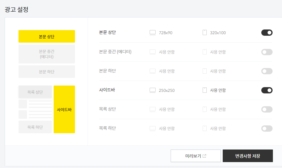 애드센스처럼 광고설정을 합니다.