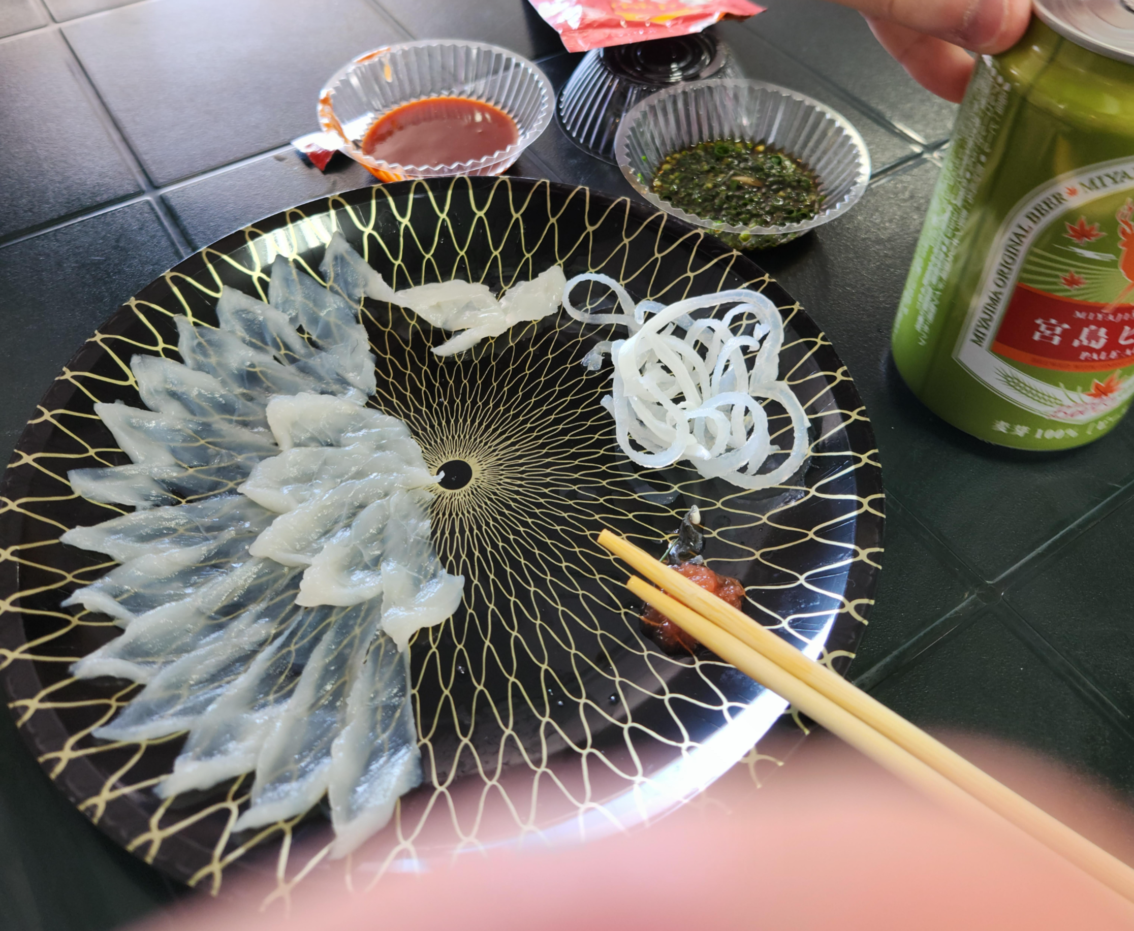 꽃처럼 이쁘게 펼쳐진 복어회가 1200엔.